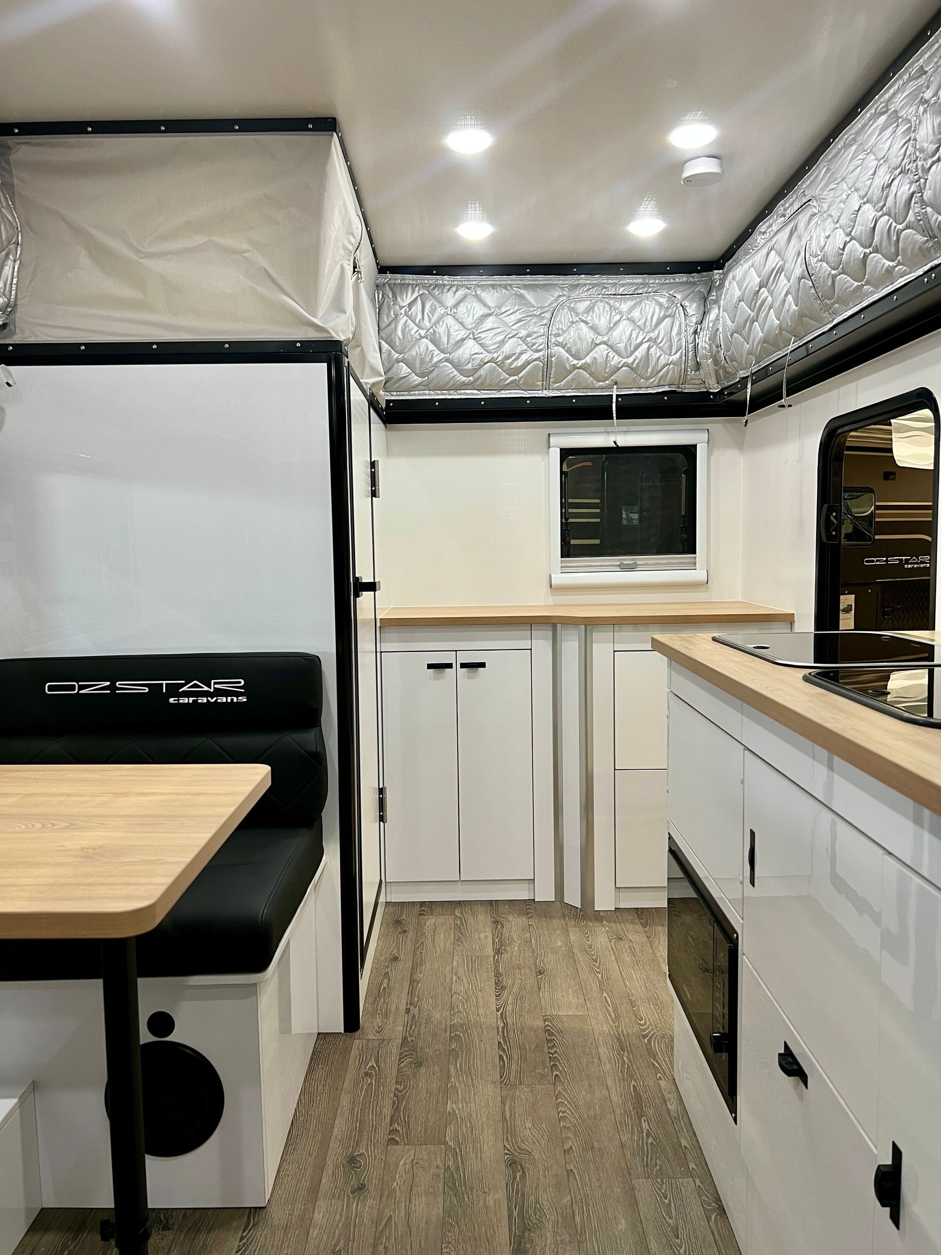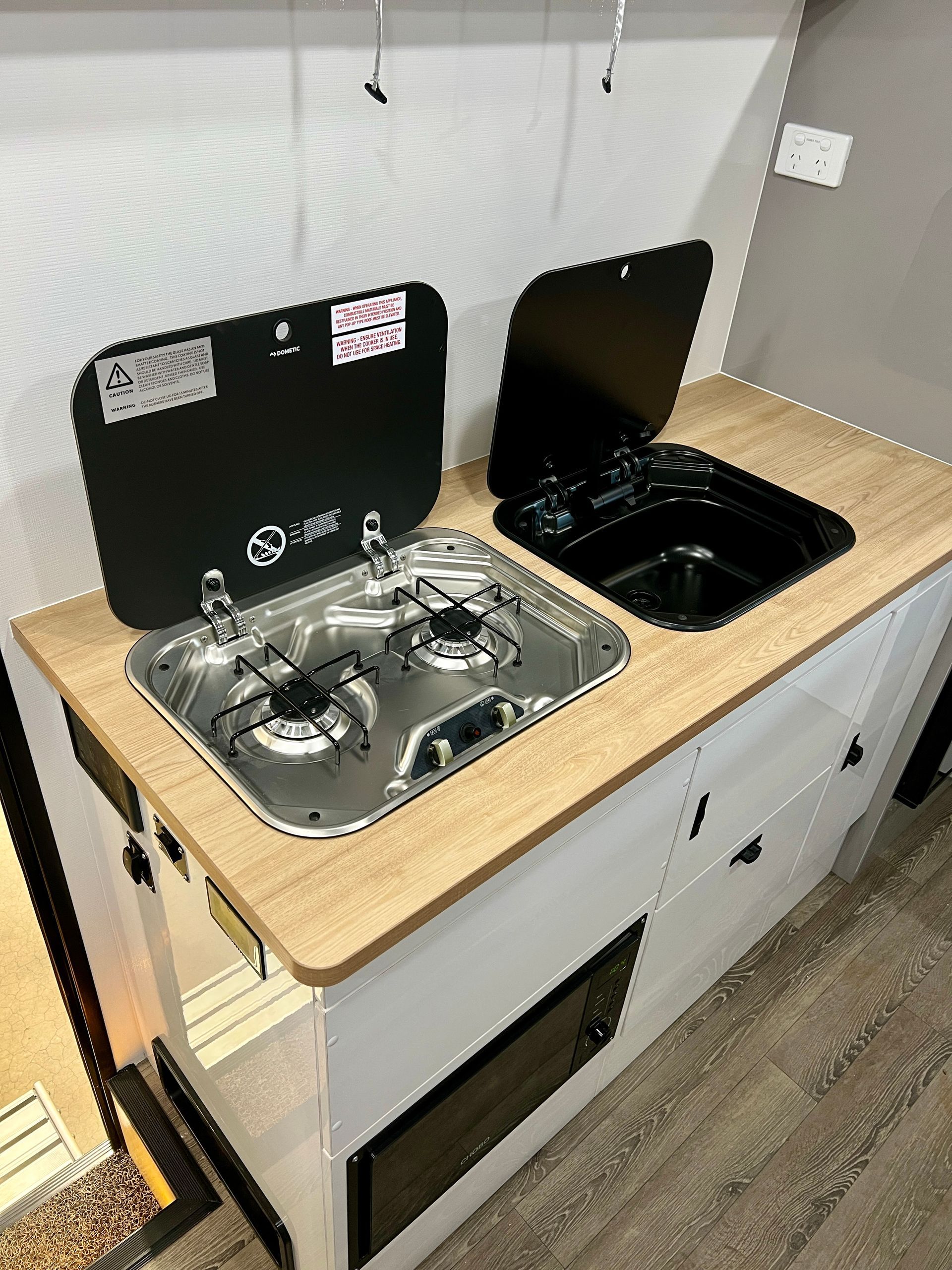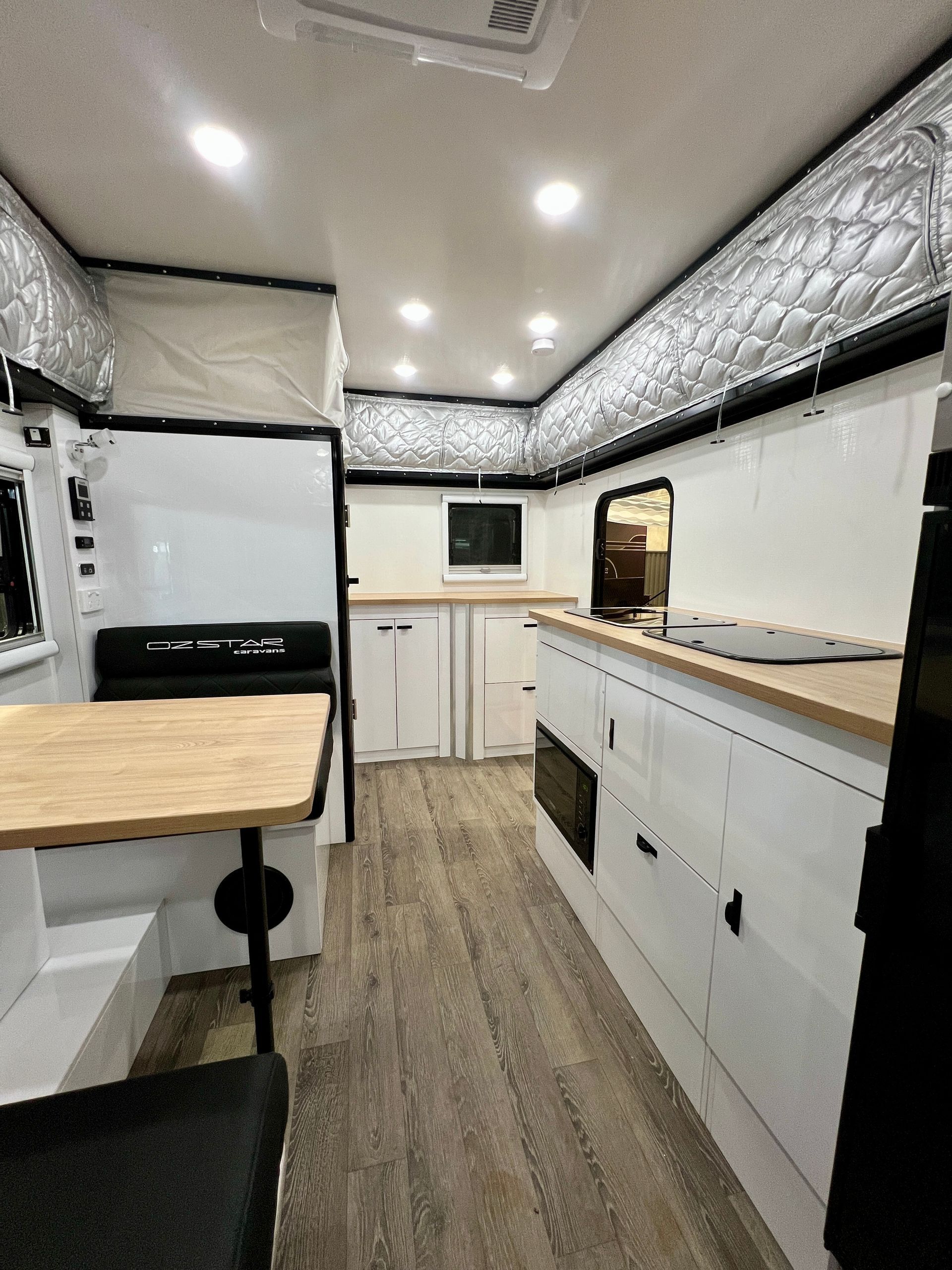 This smartly designed interior gives couples everything they need in a compact space. The 1450 x 2000mm queen bed, full ensuite with shower and toilet, and space-efficient kitchen make travel feel like home. Stylish fittings, soft leatherette seating, LED lighting, and modern appliances create a bright, comfortable space — all tailored to relaxed, on-the-go living.